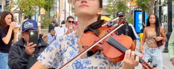 Sur une simple place, au détour d’une rue, une jeune violoniste fait naître un moment de pure magie. Karolina Protsenko, 15 ans, fait vibrer les cordes de son violon avec une intensité qui suspend le temps. Dès les premières notes de « The Sound of Silence », le public